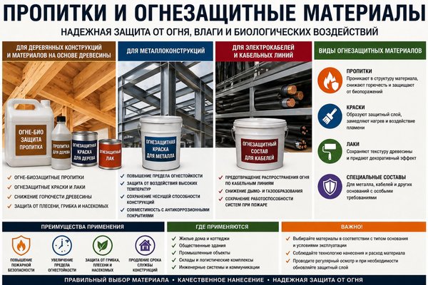 Пропитки и другие огнезащитные материалы играют важную роль в обеспечении пожарной безопасности зданий, сооружений и инженерных систем. К таким средствам относятся огнезащитные краски, составы для металлоконструкций, материалы для электрокабелей, а также огне-биозащитные пропиточные составы, препараты, краски и лаки для деревянных конструкций и материалов на основе древесины. Несмотря на общую задачу, каждая группа имеет свое назначение и должна использоваться с учетом конкретного основания и условий эксплуатации.